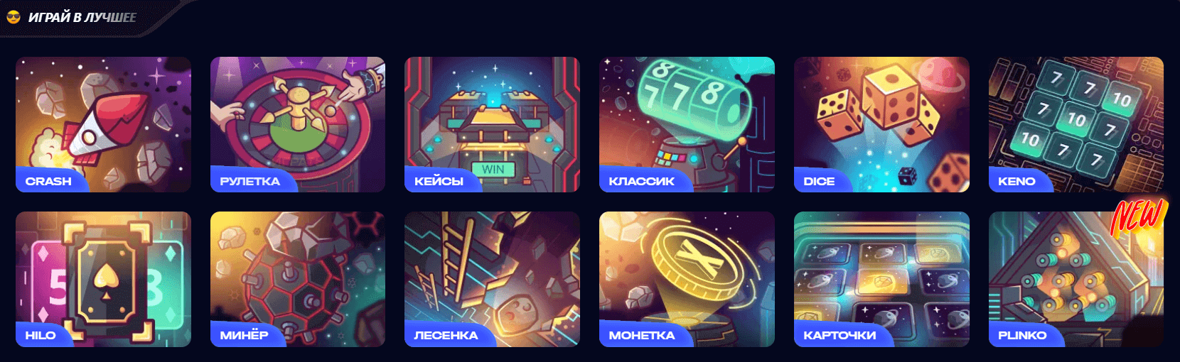 🎮 Игры Краш, Ставки на спорт, Рулетка, Кейсы, Классик, DICE, Keno, Hilo, Минер, Лесенка, Монетка, Карточки, Слоты, Плинко