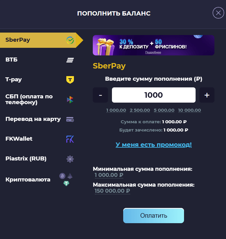 💳 Методы депозита Перевод на карту, СБП, Piastrix, SkyPay, FK Wallet, SkinsPay, Криптовалюты